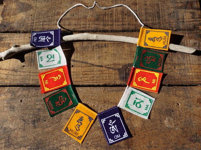 タルチョ 祈祷旗 ●「タルチョ」は、チベット仏教由来の祈祷旗。 旗の色は、青、白、赤、緑、黄の順番で決まっており、それぞれ天・風・火・水・地を表現しています。 旗に書かれている経文は、風になびくたびに読経したことになると信じられています。 ●チベット仏教でよく唱えられている言葉 オム・マニ・ペメ・フム「Om Mani Padme Hum」 「蓮花の中の宝珠」という意味があり、オム・マニ・ペメ・フムの言葉を唱えることにより悪行から離れ、得を積み、悟りが開かれると信じられています。 ●ネパールの仏塔には、たくさんのタルチョが吊るされていてとても綺麗です ●こちらのタルチョはミニサイズなので部屋の飾りにピッタリです。カラフルでエスニックな感じ! 現地では、ミニタルチョを車やバイクに飾ったりしてる方もいます。 サイズ(旗1枚 縦約5.5cm〜3.6cm)×(10枚の旗が連結)全長68cm 原産国:ネパール
