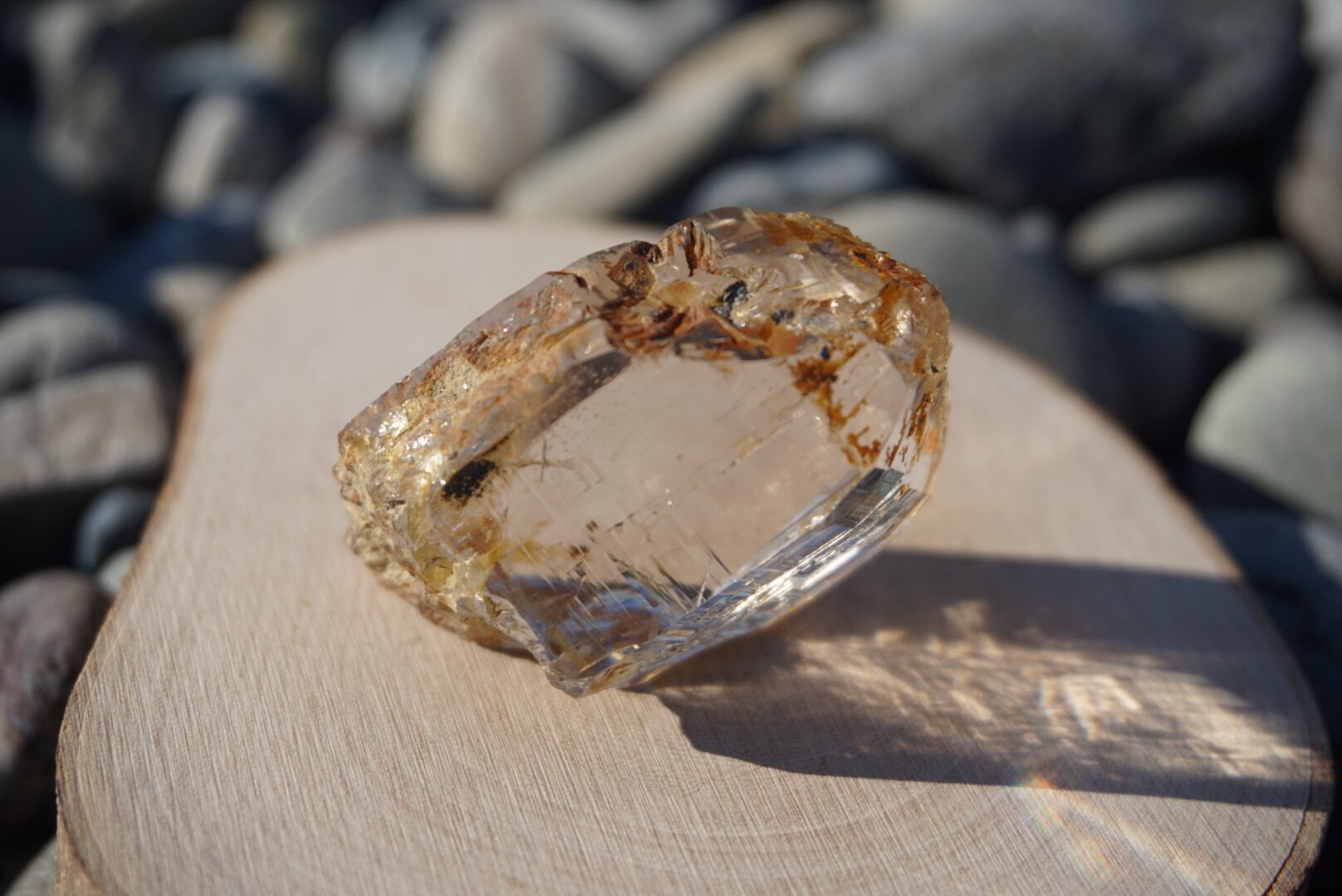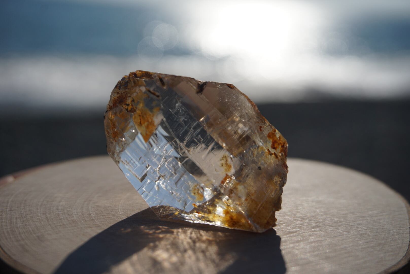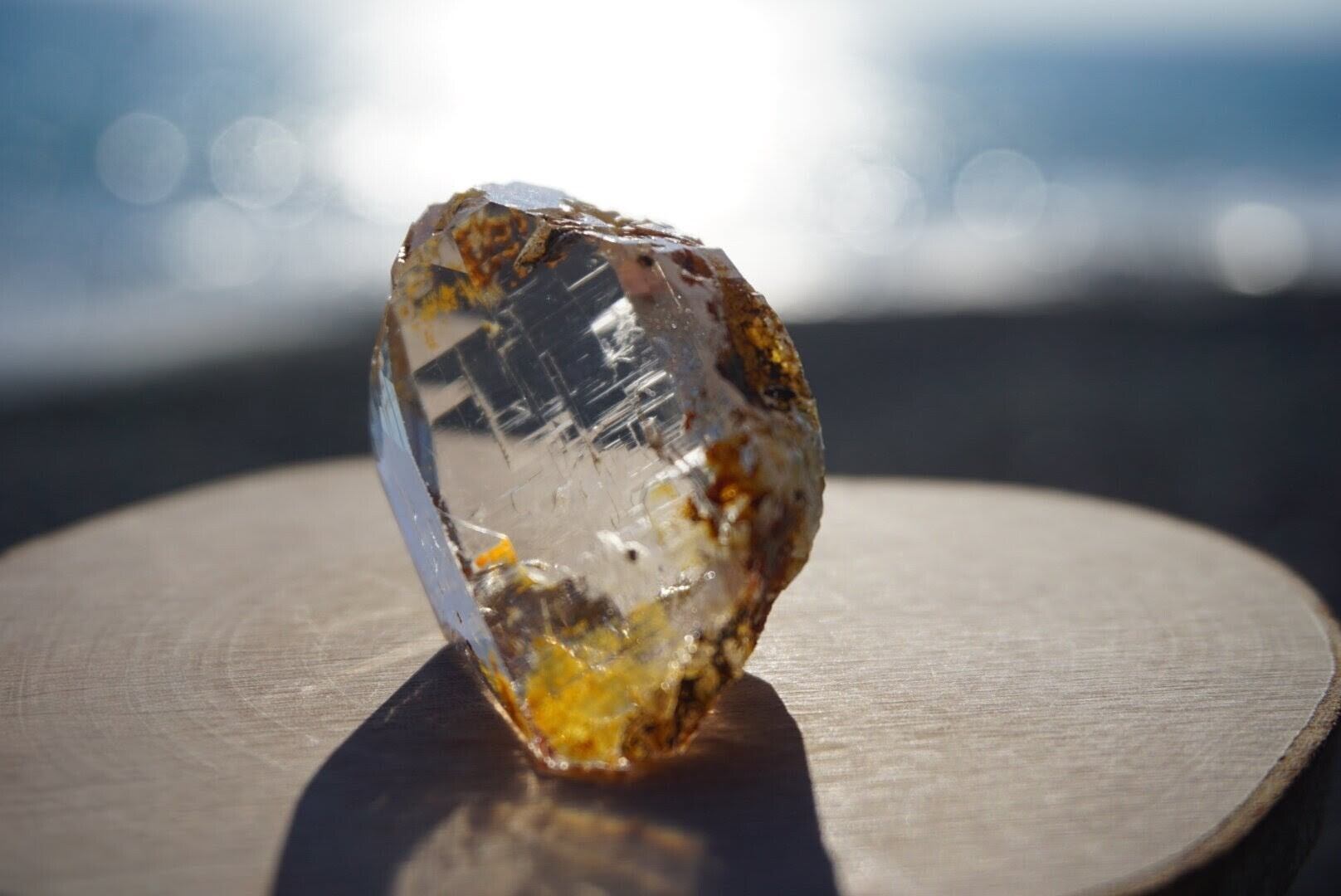 ポイントの表面に淡いオレンジのリモナイトやマグネシウムなどの鉄分が長い時間をかけ水晶の表面にコーティングされたゴールデンヒーラーと呼ばれる水晶です。