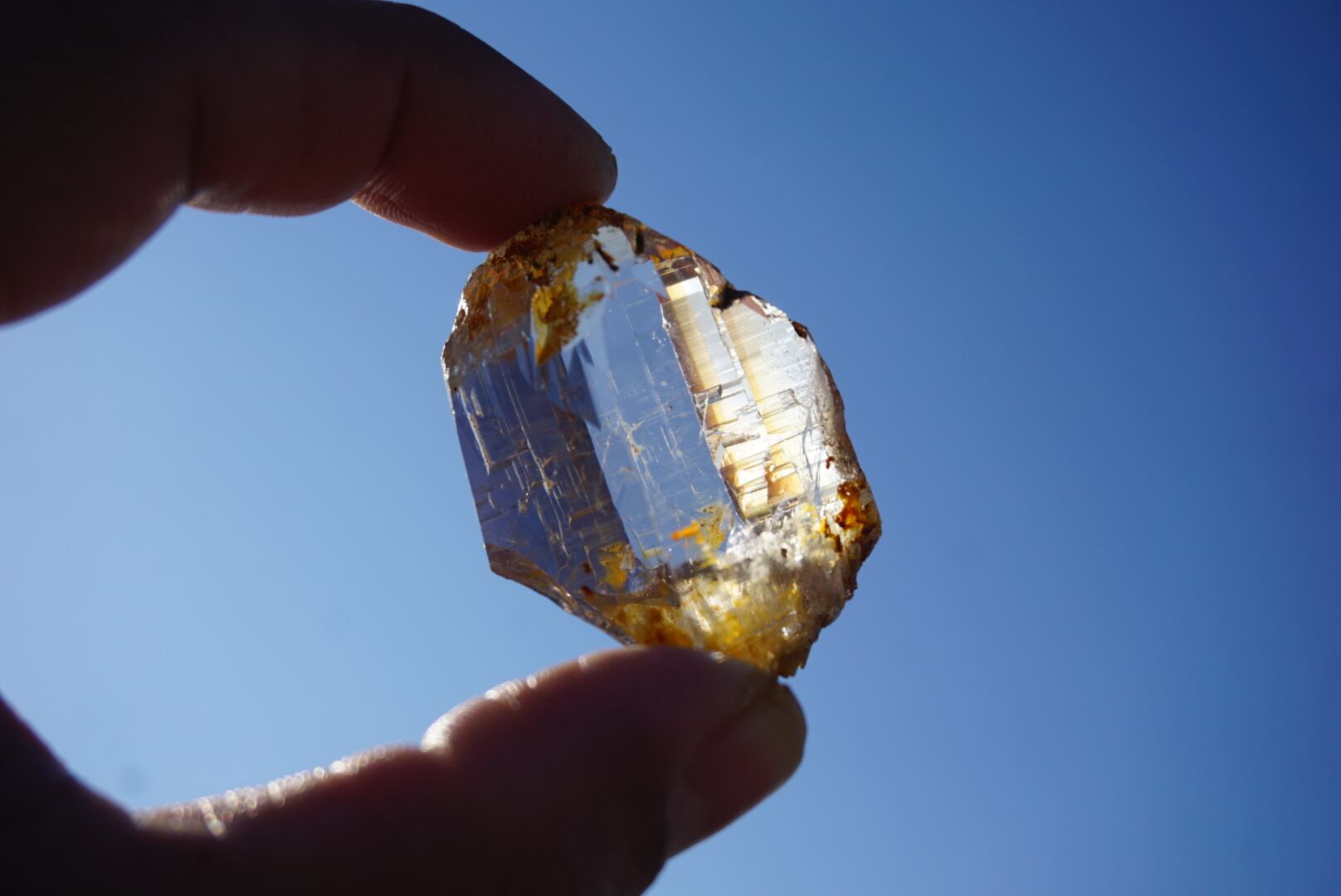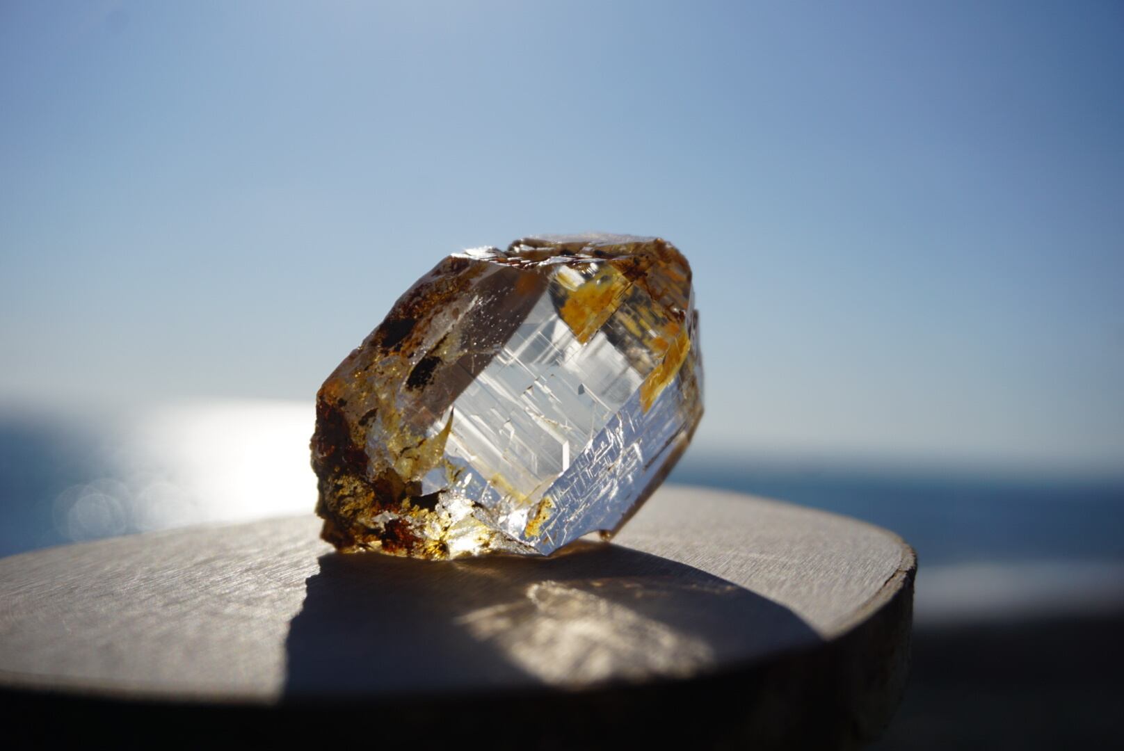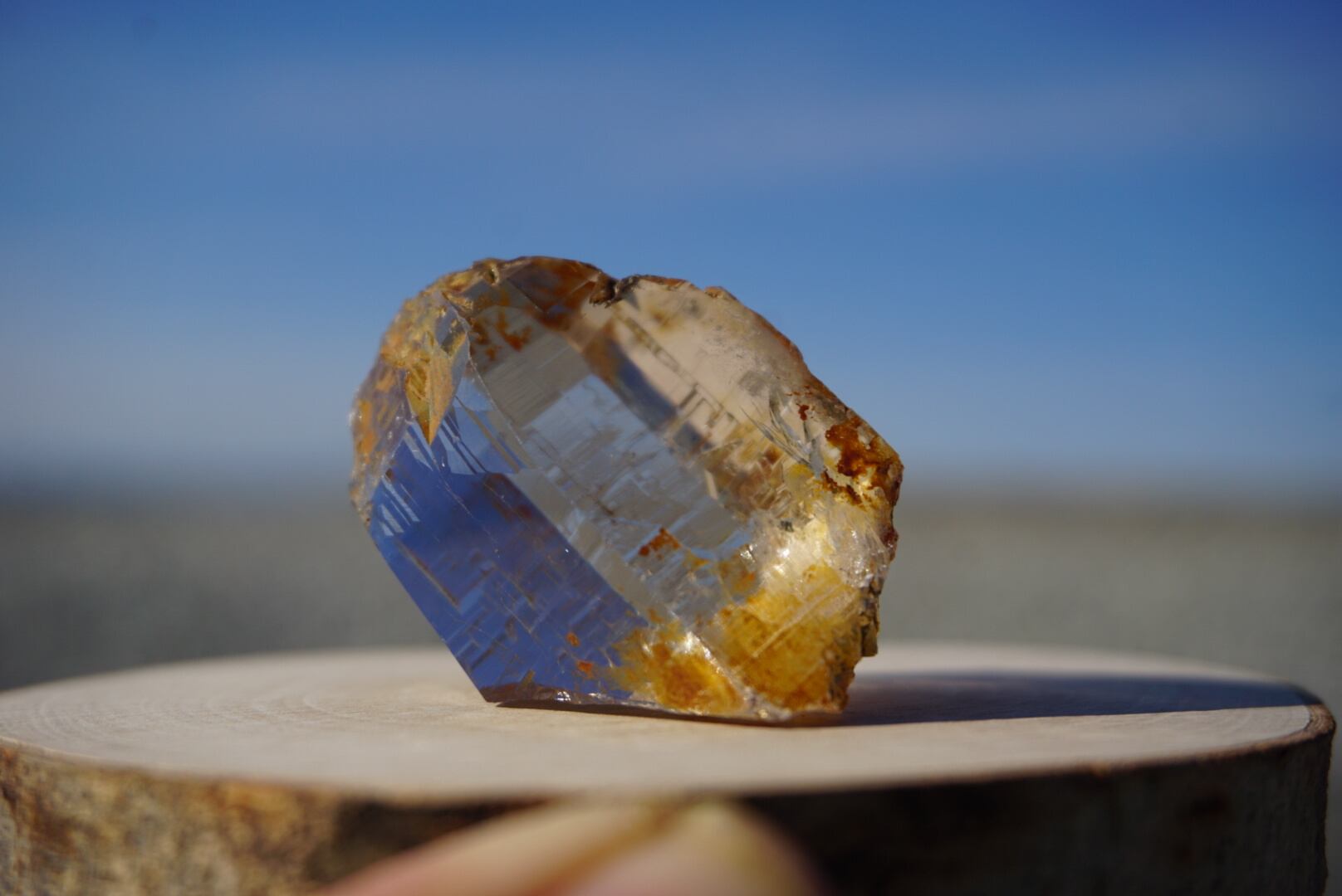 ポイントの表面に淡いオレンジのリモナイトやマグネシウムなどの鉄分が長い時間をかけ水晶の表面にコーティングされたゴールデンヒーラーと呼ばれる水晶です。