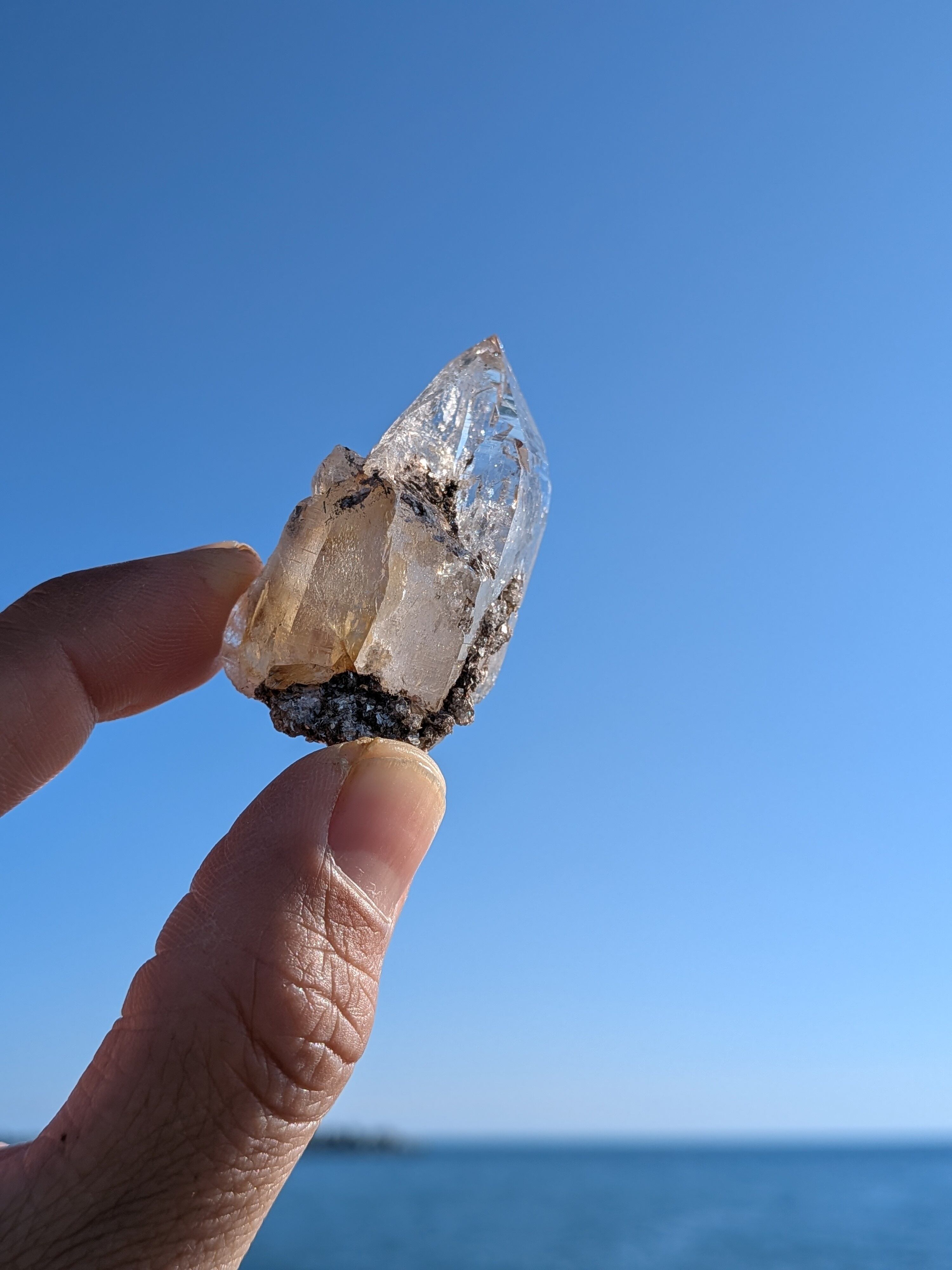 薄っすらと淡いオレンジ色のリモナイトが入っており、ポイントの先の形もとても綺麗な水晶です。