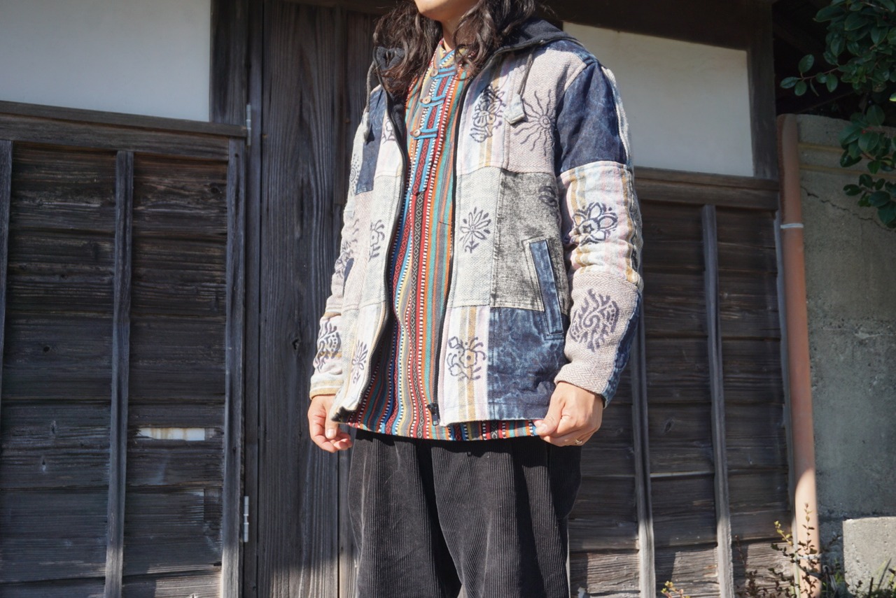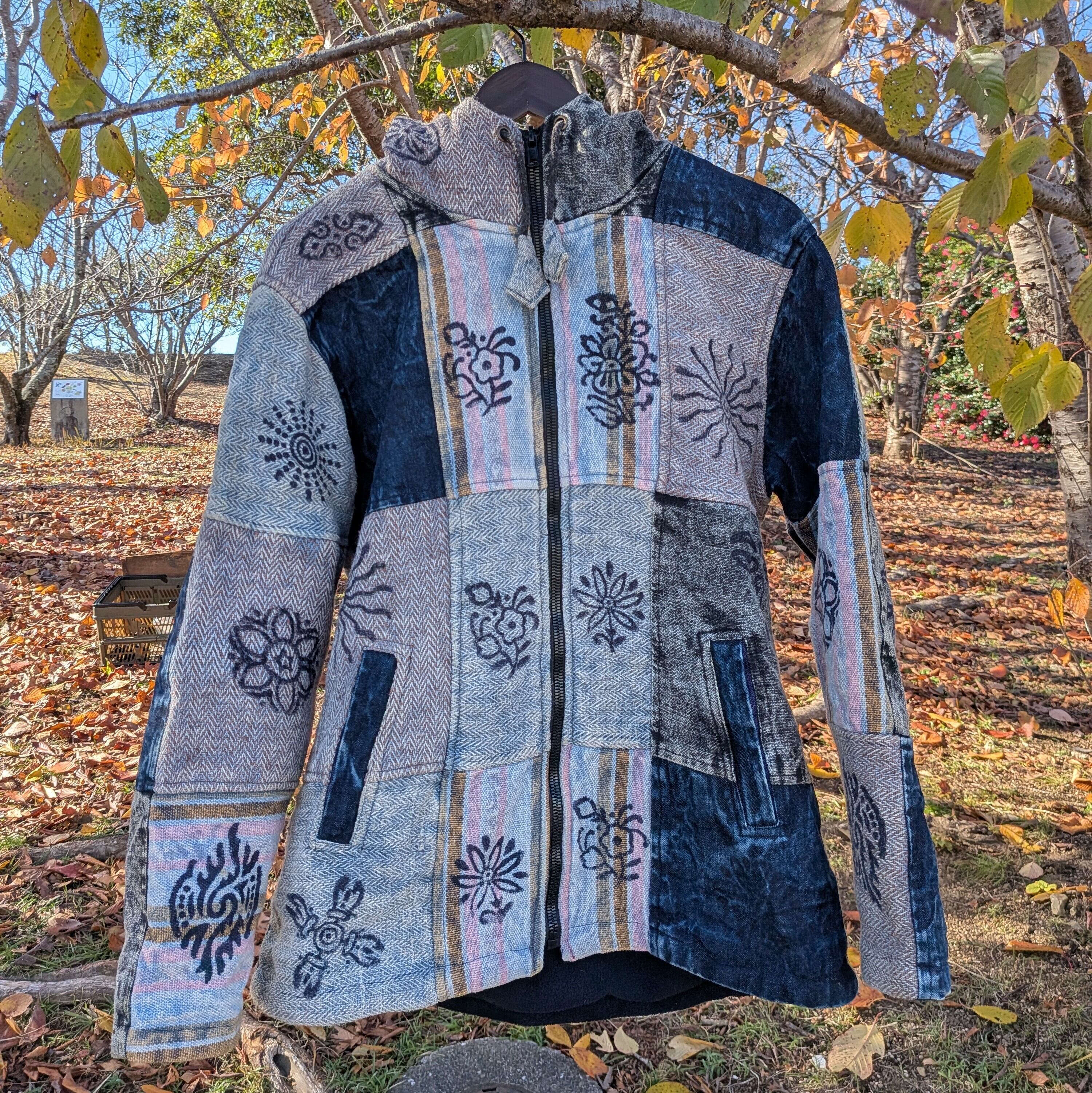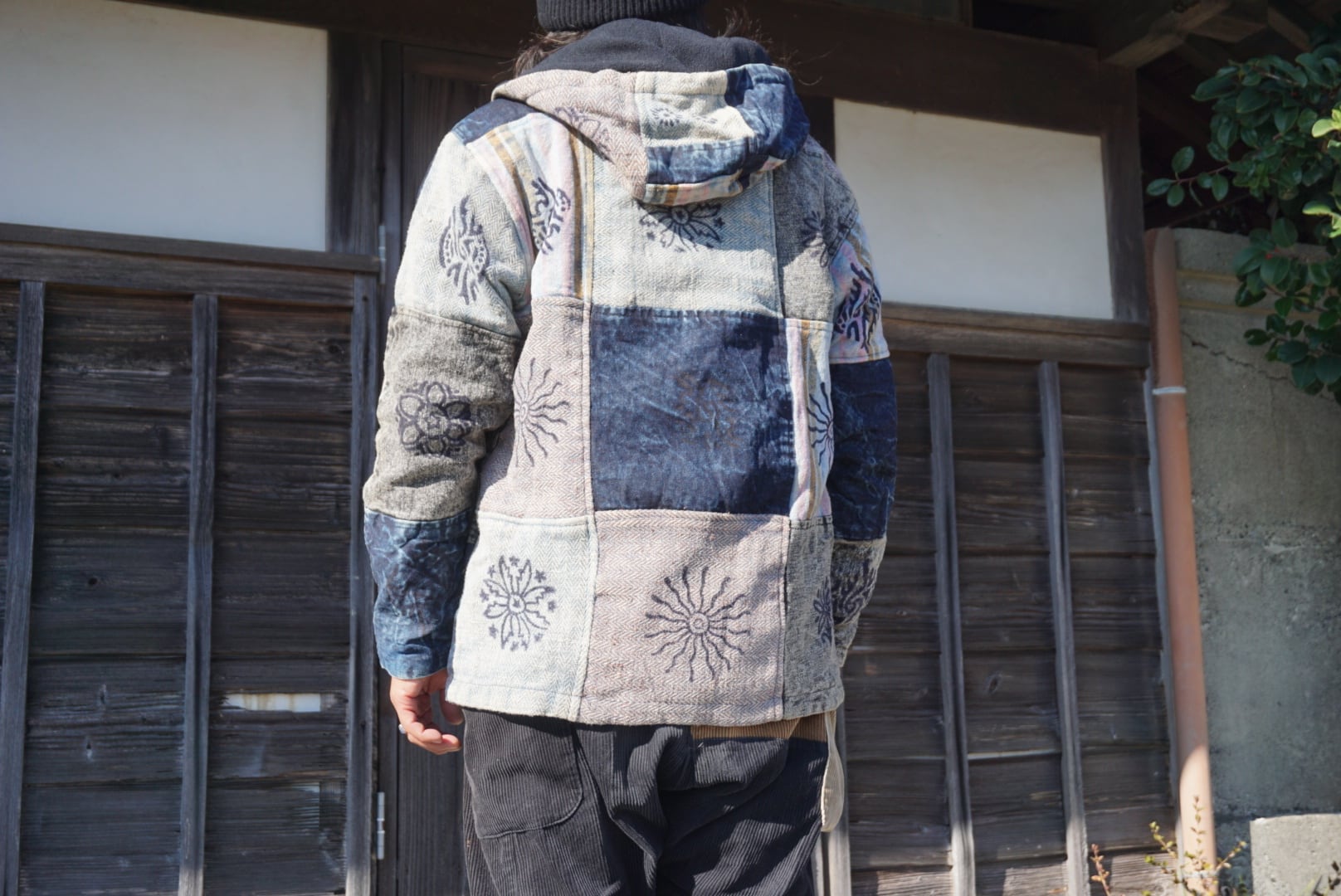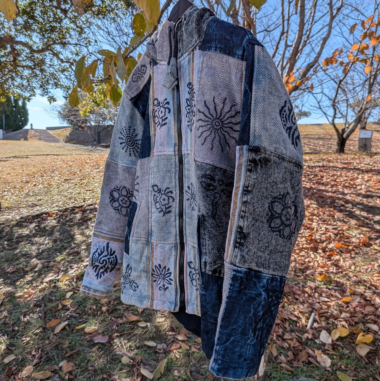 花や太陽がモチーフのパッチワーク柄のジャケット。