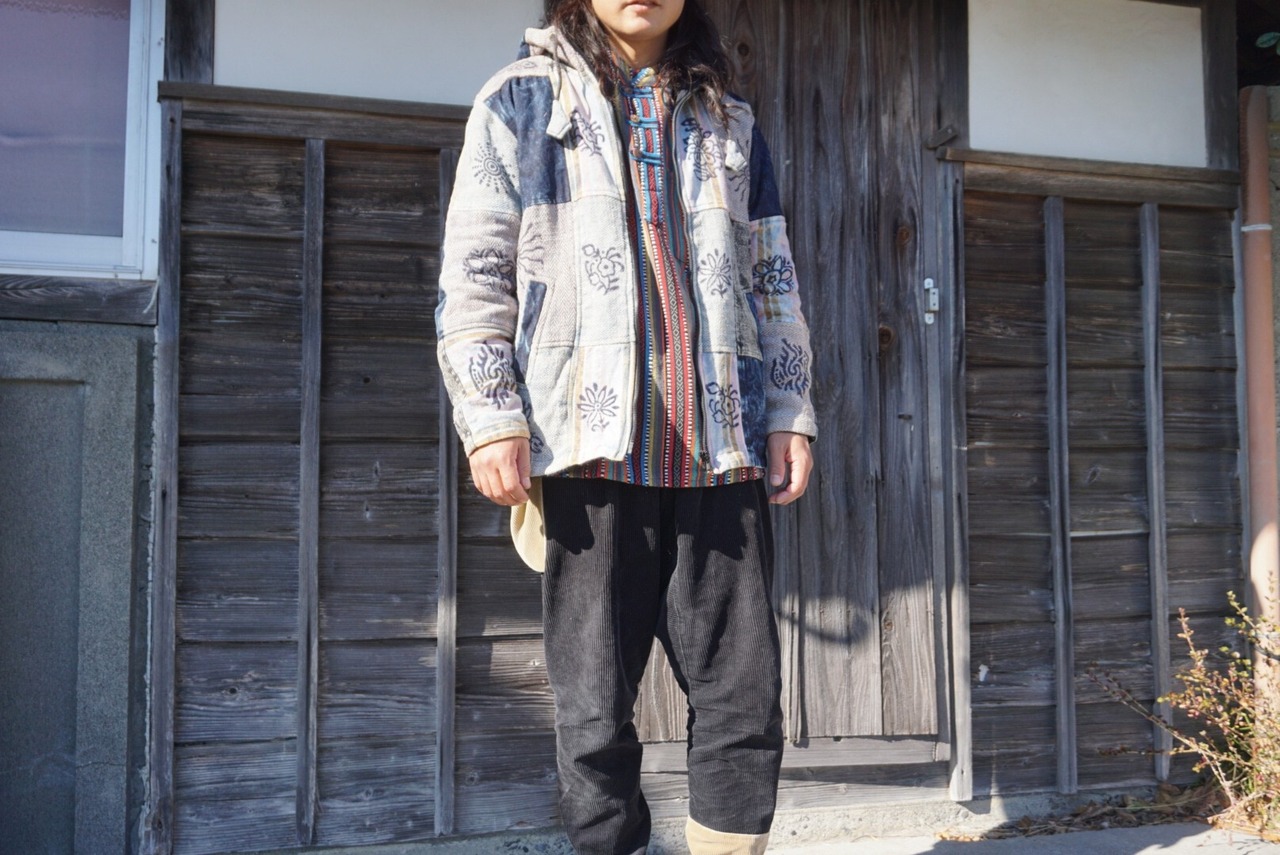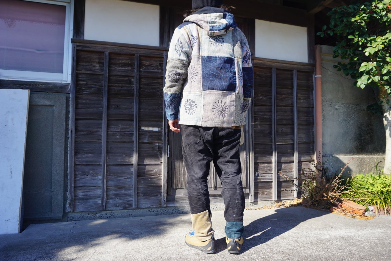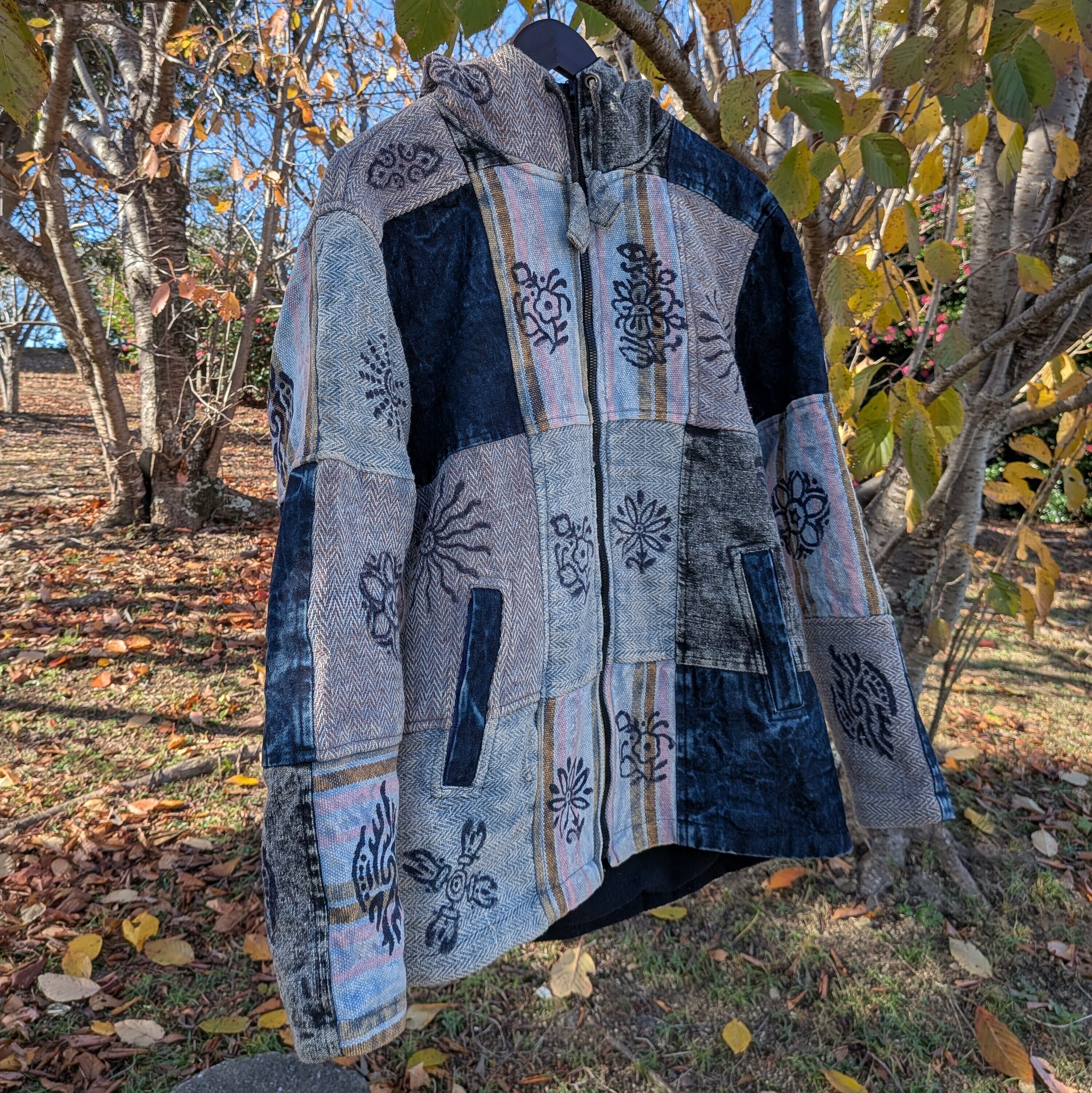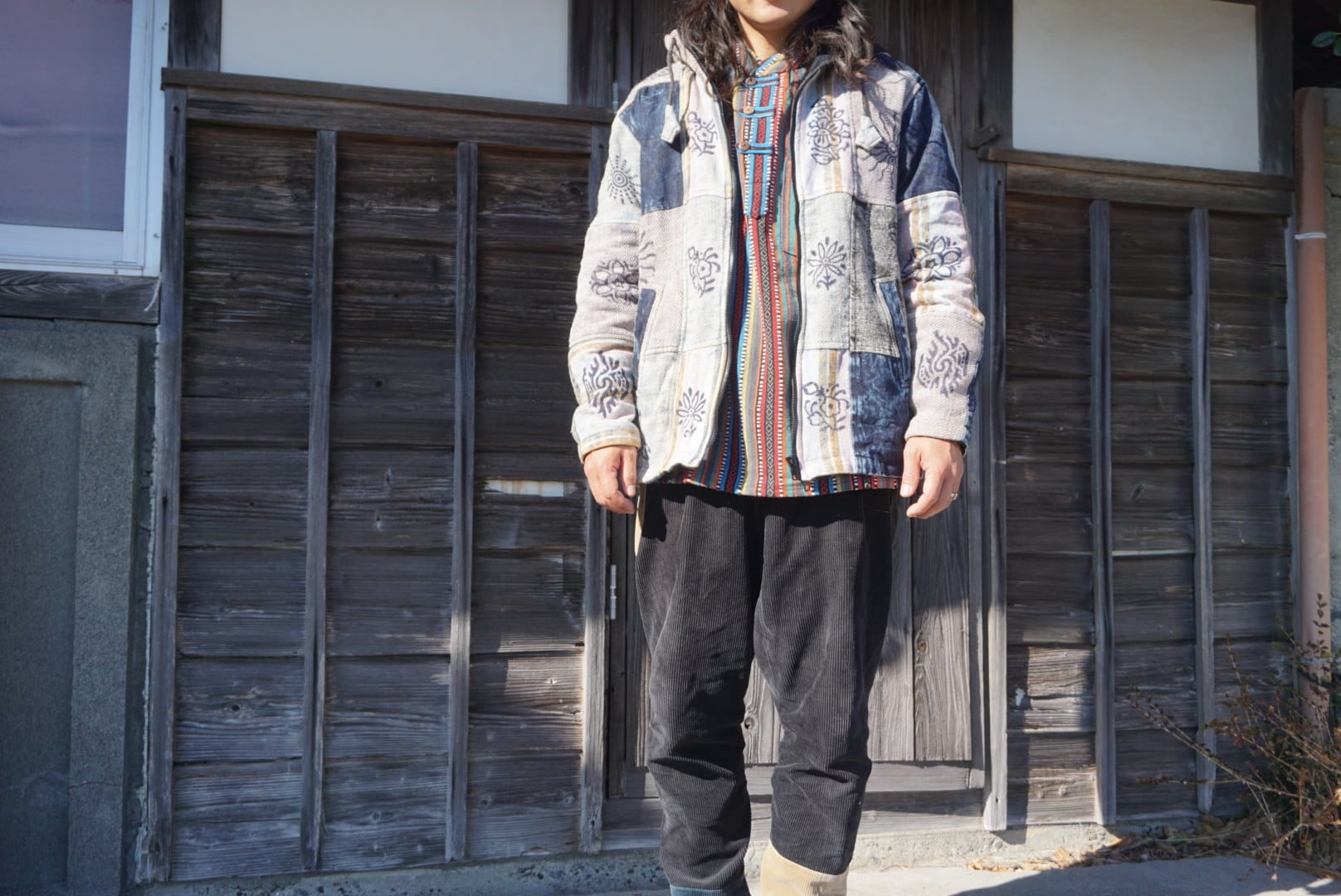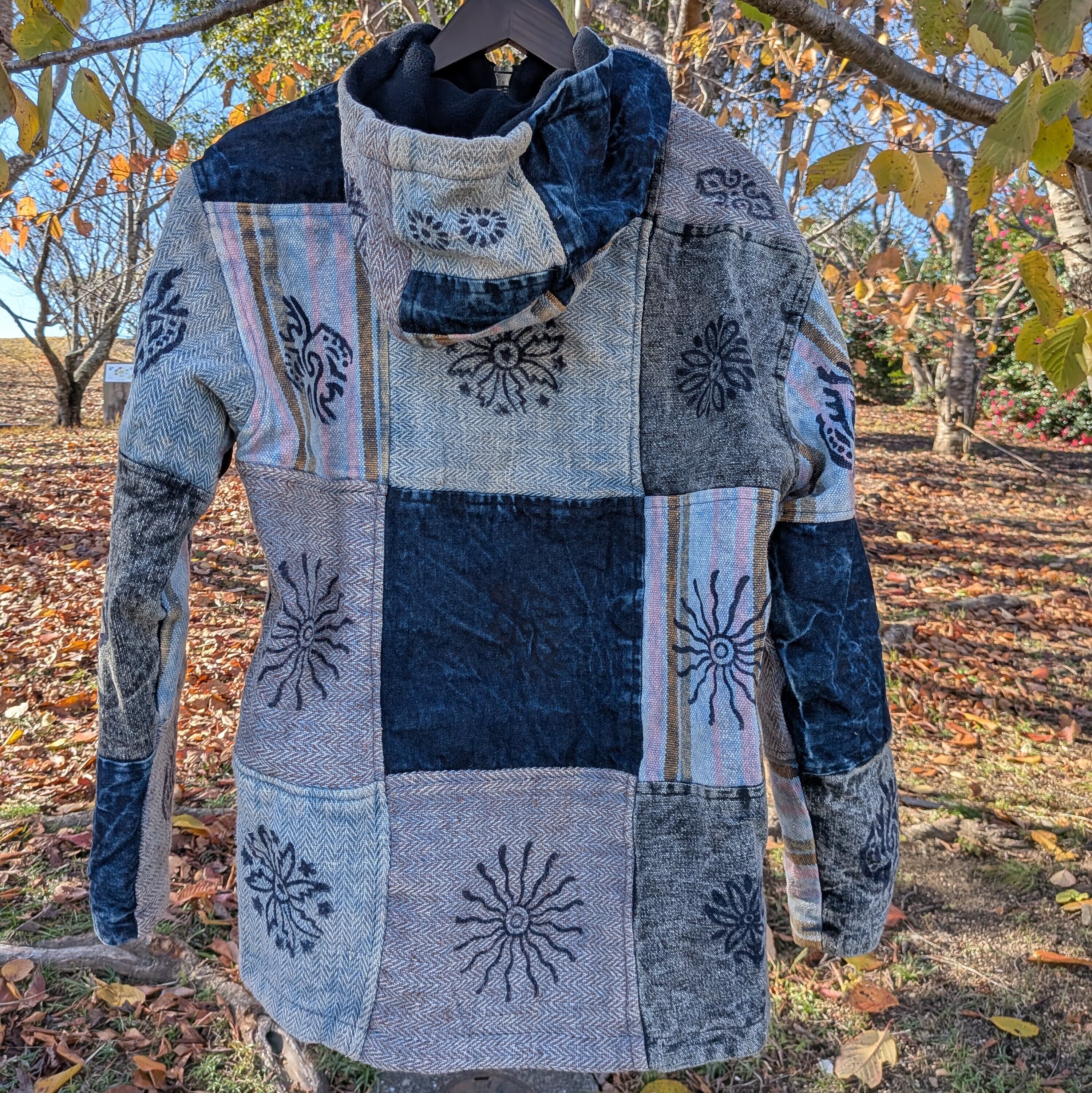 花や太陽がモチーフのパッチワーク柄のジャケット。