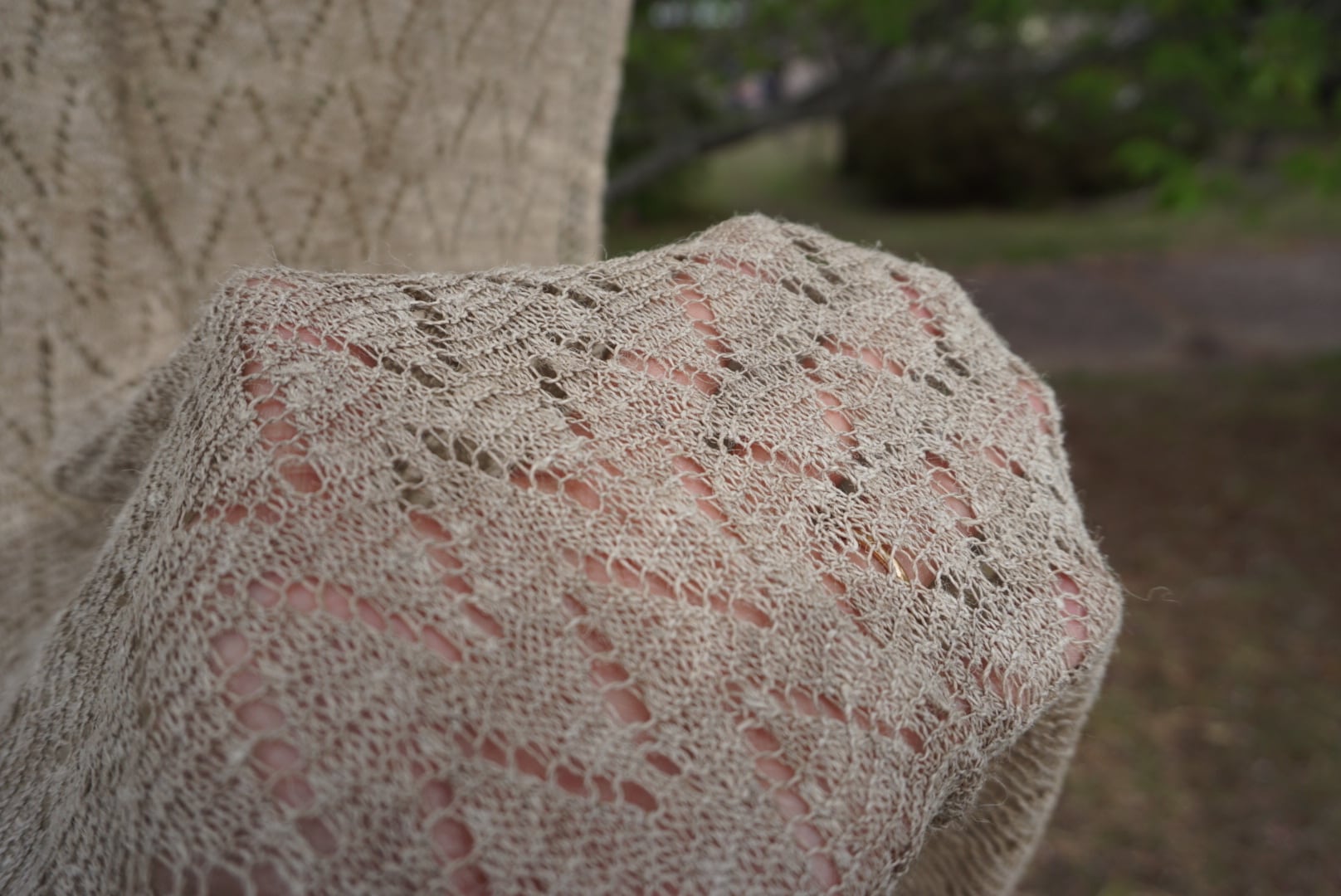●こちらのネトルショールは、細めに紡がれたネトルを使用し、きめ細かなトライアングルのデザインが特徴的です。
