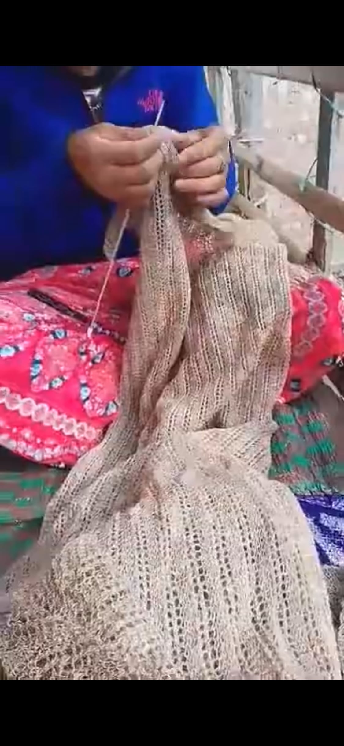手紡ぎした素材を毎日少しずつ手編みし、約1か月かけてやっと完成します。