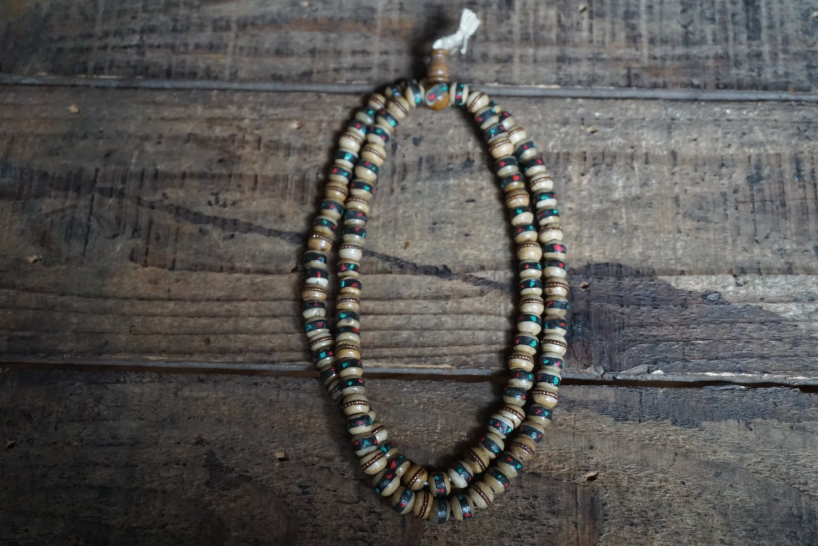 ネパール産のバッファロー(水牛)ボーンに職人さんが珊瑚とターコイズを手作業で埋め込んだビーズ。