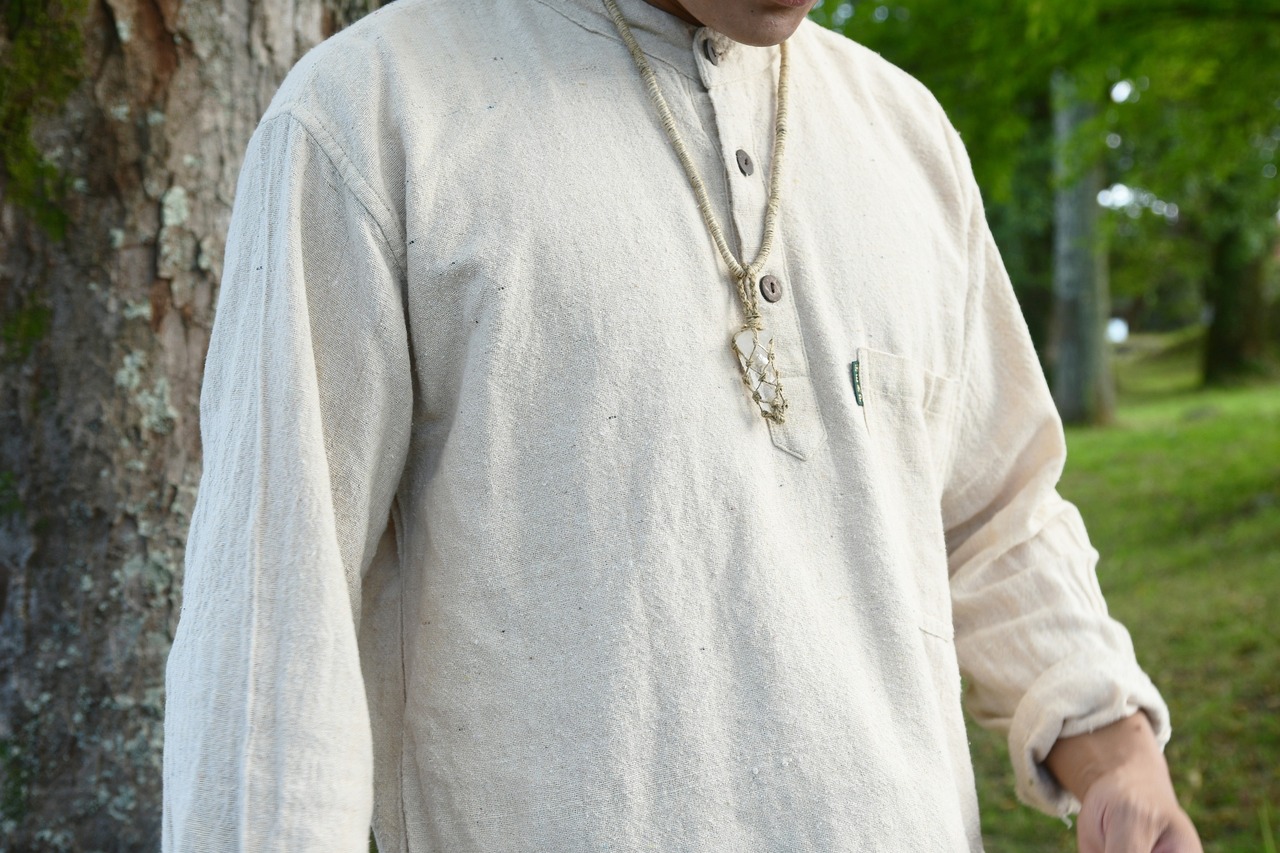 ネックレスの紐は、ヘンプ(麻)を編んで作られており、ヘンプ紐に厚みと幅があるので長時間つけていても、疲れにくくなっています。