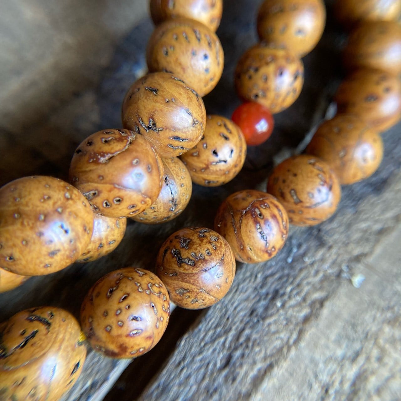 お釈迦様は菩提樹の木の下で悟りを開いたとされており、菩提樹の実は高徳のある素材として古来より念珠として使用され、チベット仏教の僧呂は首にかけたり、手に巻いて持ち歩いています。